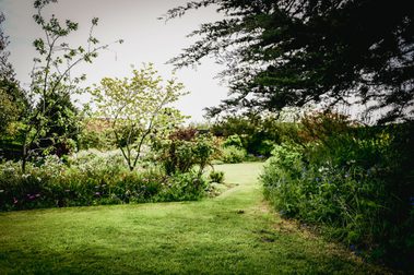 There is a kitchen garden with fruit bushes and vegetables. The orchard contains apples, pears and stone fruit. The rose terrace contain plants such as delphiniums, roses and irises which were loved by Britten and Pears.