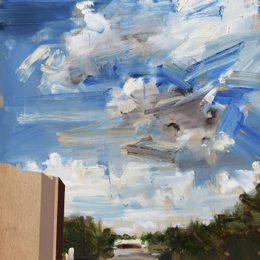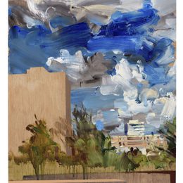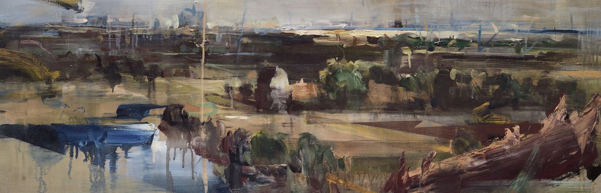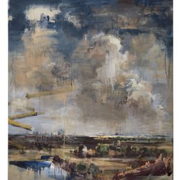 Kate Giles’ recent work is a response to and reinterpretation of Jacob van Ruisdael’s “View of Haarlem with Bleaching Grounds” (c.1670–75 Kunsthaus Zurich) in dialogue with snatched glimpses of present day urban development under comparable big skies along the railway line from Sloterdijk to Haarlem: C17th and contemporary “Haarlempjes” (Haarlem scenes). It is the artist’s intent that the eye is caught up dancing to the music and geometry of time, space and volume, united by a congruent palette.