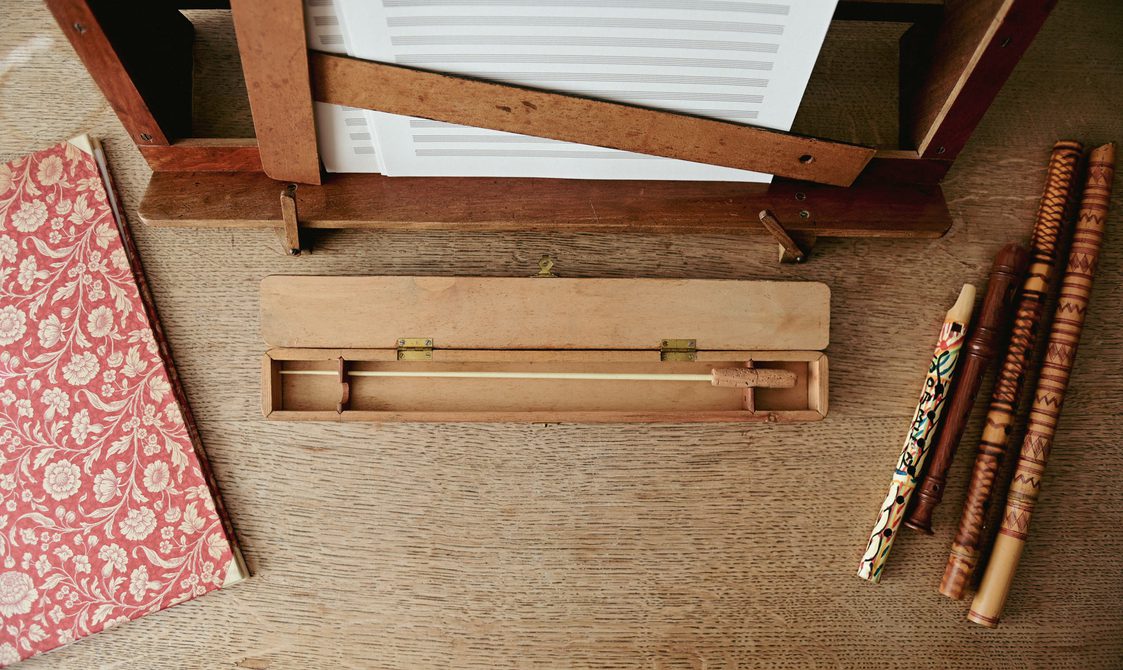 Never particularly materialistic (when Britten left her a bequest in his will, she handed it out to “several intelligent children, aged 10-13” [7]), inside the one-bedroom bungalow a few key, talismanic possessions remain: There’s Holst’s well-travelled conductor’s baton – she was one of the first women to conduct military and brass bands, and brought a dancer’s flair to the task; a collection of handbells on a shelf that nod to her love of ringers and the works she composed for them; and a soundproofed music room with piano that ensured the many hours she spent listening to classical Indian ragas didn’t disturb the neighbours. (In 1950, she had spent two months at Santiniketan University in West Bengal learning Indian dance and notation – she reciprocated by performing a Romanian sword dance among other European folk steps.)