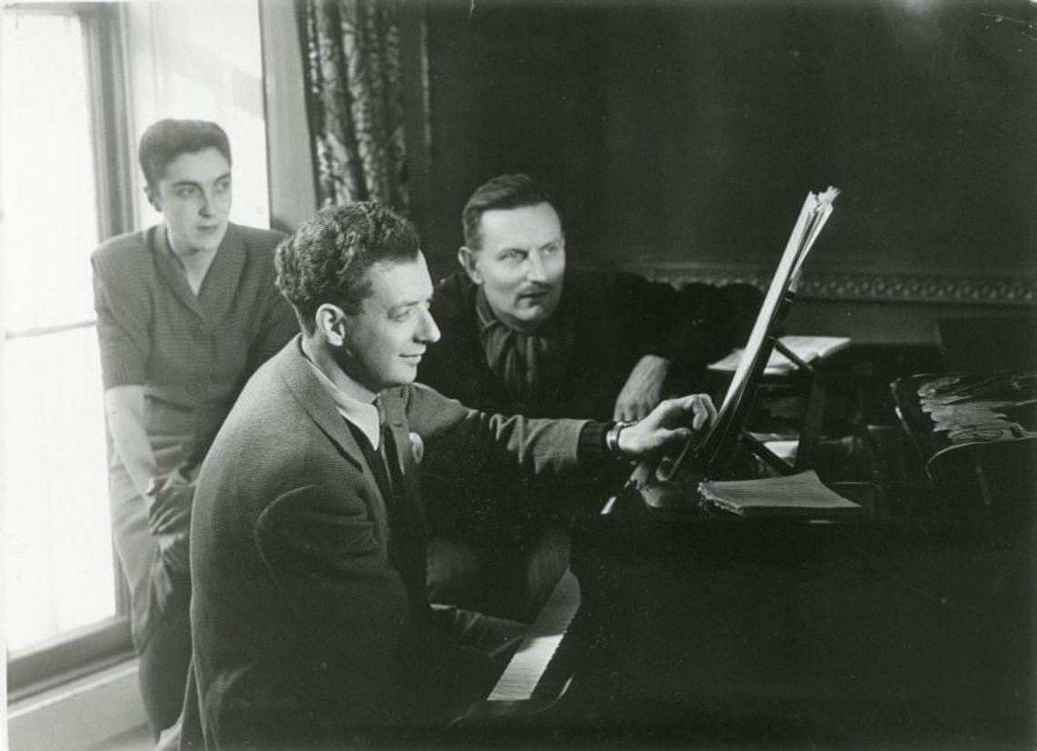 Britten with producer, Tyrone Guthrie, sitting on his left, and the designer Tania Moiseiwitsch behind.