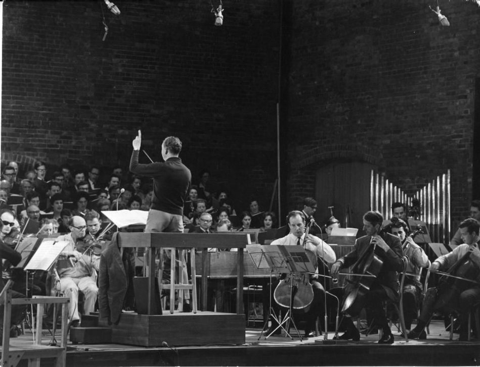 Britten conducting a rehearsal for the opening of the Snape Maltings Concert Hall, June 1967. Anita Lasker-Wallfisch, 2nd cellist on right. Photograph: Hans Wild