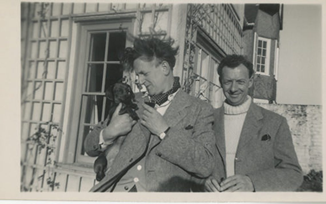 Britten and Pears outside Crag House in summer 1957, a few months before moving to The Red House, with their puppy Jove (Photographer: unidentified)