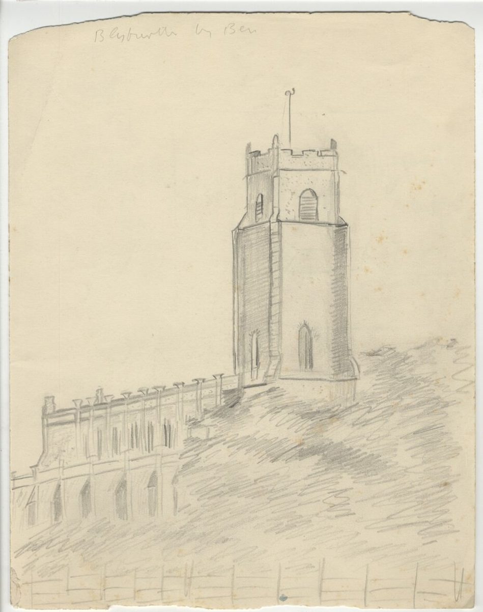 Pevsner described the tower of Blythburgh as “impressive enough when seen across the creek”. We can see this vantage point through the eyes of Britten himself. In the 1950s, planted in the shadow of Blythburgh, Britten and Pears had a sketching lesson with Mary Potter. This excursion proved fruitful with Britten committing several pencil sketches of Blythburgh to paper.