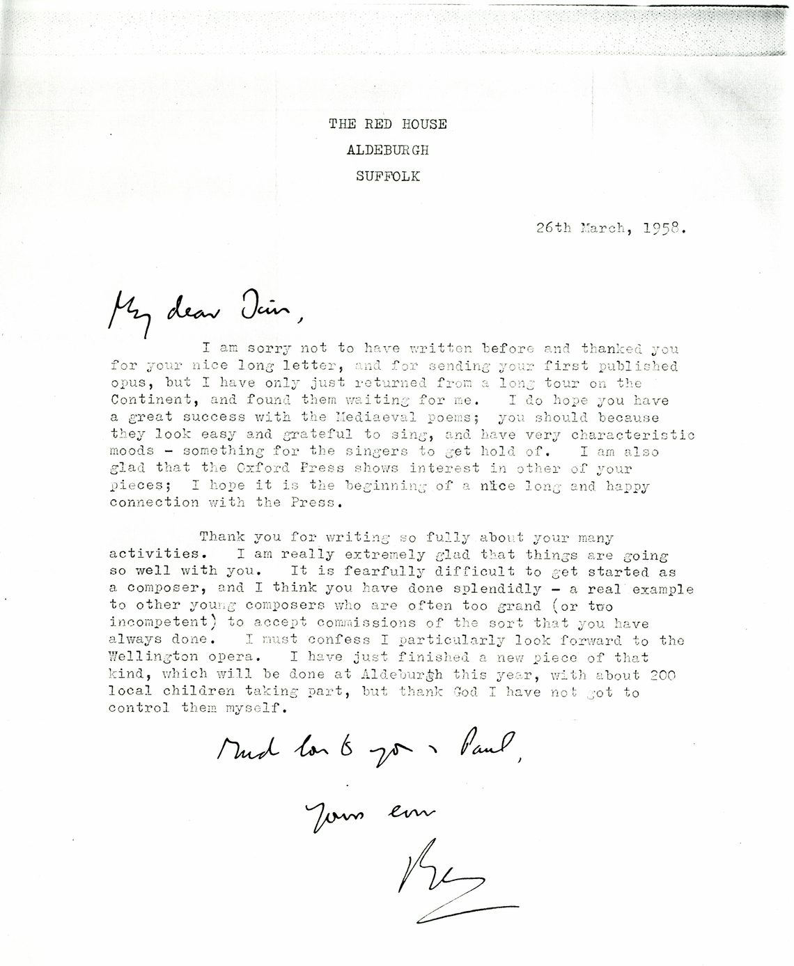 Britten’s letter of congratulation on publication of James Bernard’s Three Medieval Poems, 1958.
