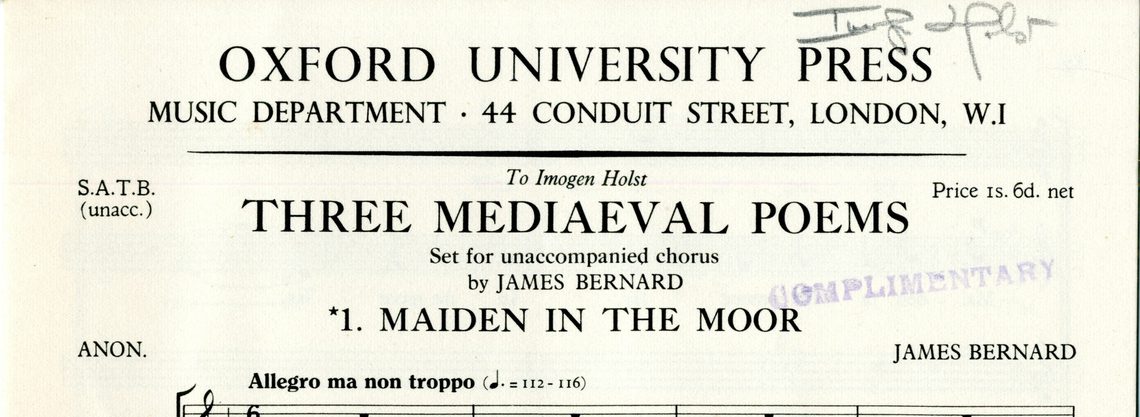 Britten also nominated Imogen Holst as another source of advice on composition. She was highly valued as a mentor and a few early manuscripts of Bernard’s still exist in the Holst Archive. Her influence can be gauged by the fact that his first published work, a setting of Three Medieval Poems, is dedicated to Holst.