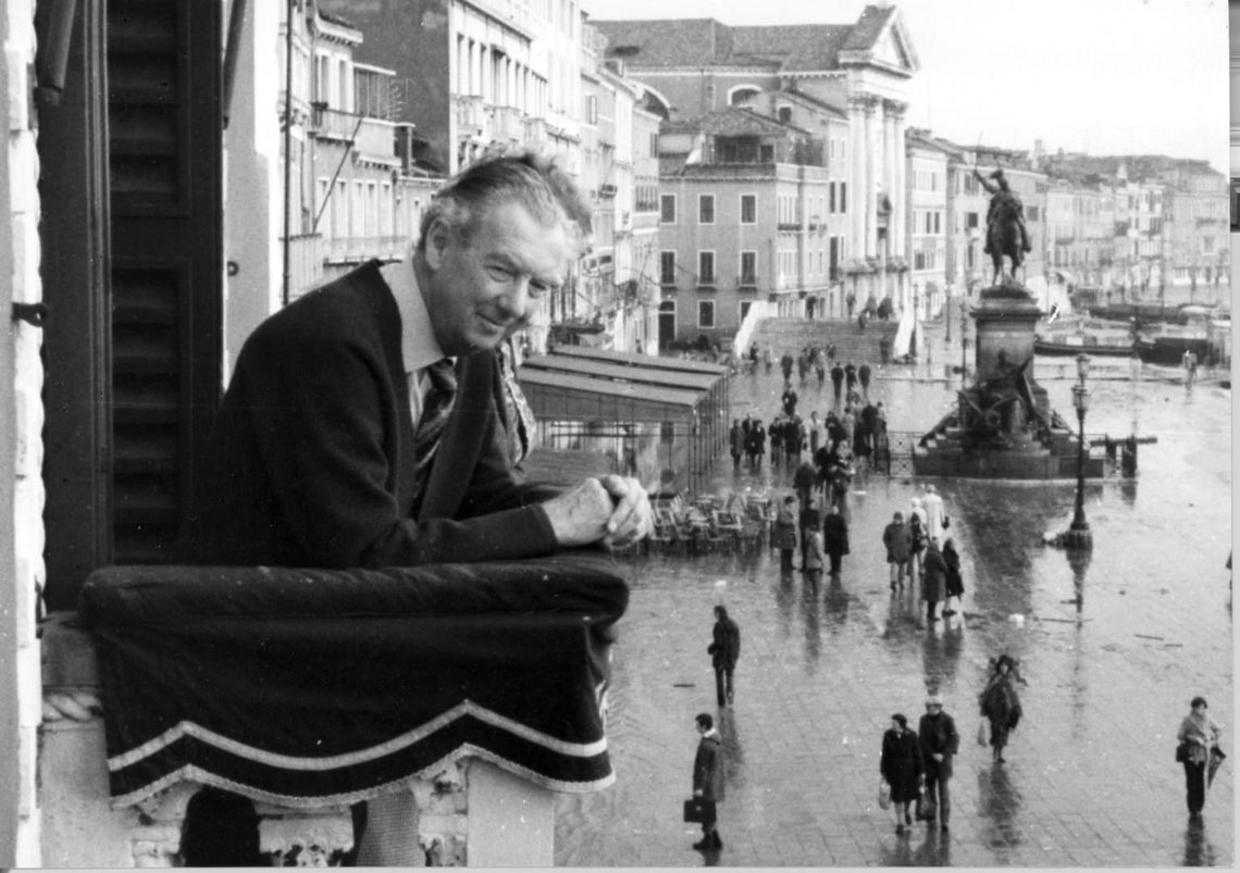 Photograph of Britten leaning on the balustrade at Hotel Danieli looking at the passers-by in the street below. The outline of Rita Thomson, standing next to him, is just visible. November 1975. Photographer: William Servaes.