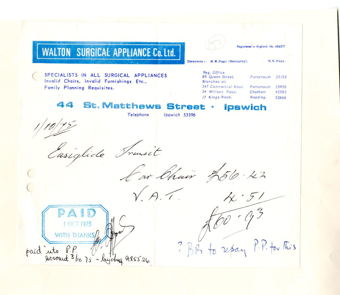 One little item in Britten’s financial receipts brings this home to the researcher. On the first of October 1975, the papers record a purchase from the Walton Surgical Appliance Company Limited of St Matthews Street, Ipswich: an Easiglide car seat (archive reference: BBF/2/30/157). The purpose of this device was to make it easier to transfer a patient from one sitting position to another, bridging a gap or dealing with a change in height. In this case, it is an indication that Britten was spending much of his time in a wheelchair, and needed help transferring between this and the seat of a car.