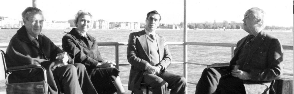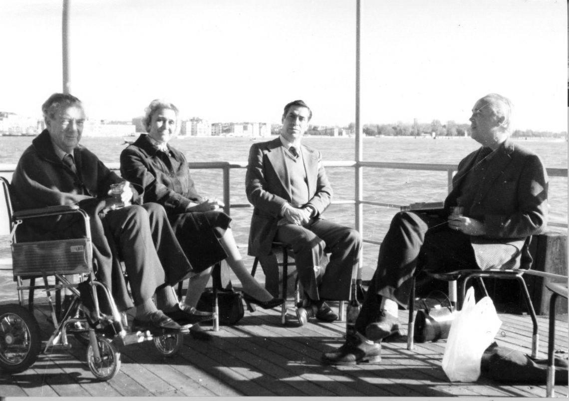 Photograph taken by Rita Thomson with, left to right, Britten, Pat Servaes, Esteban Cerda and William Servaes seated by the lagoon in Venice, November 1975.