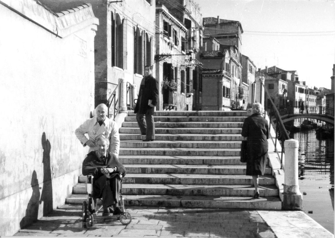William Servaes pushing Britten in a wheelchair by a bridge over a canal. On the steps stand Pat Servaes, with her back to the camera, and Esteban Cerda. November 1975. Photographer: Rita Thomson.