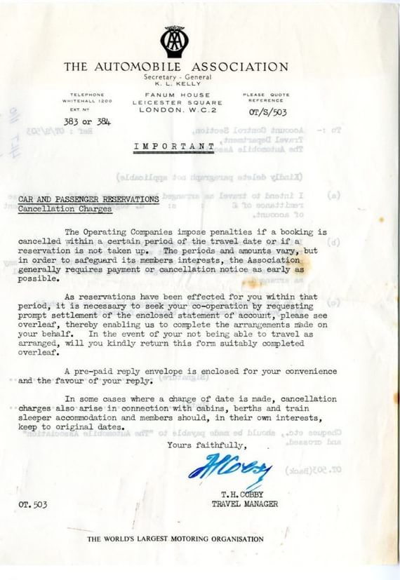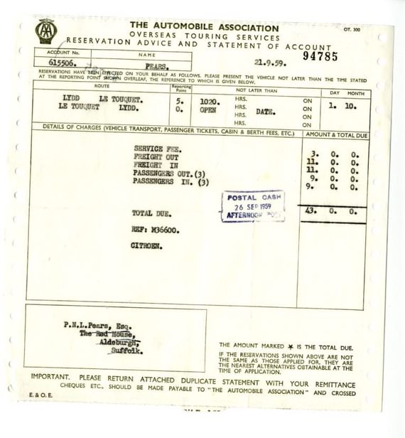 The service was always a premium one; not merely because of the speed, but also because of limited capacity, each aircraft accommodating only three cars. The alternative for someone wanting to take their own vehicle to France rather than hire another vehicle there, however, was to have the vehicle lifted laboriously into the hold of a ship, so the air ferry had a market. In late 1959 we see Pears, Britten and their friend the artist Mary Potter – from whom they had bought the Red House not long before – travelling with a Citroën car on the air ferry between England and France. The documents are slightly confusing: there are printouts recording a booking to travel between Lydd and Le Touquet in early October, and the return half of a ticket on the Southend-Calais route at the end of the month.