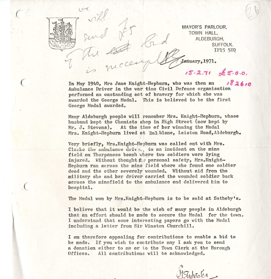 Another of Britten’s first recorded transactions in decimal currency, again on 15th February 1971, is a donation to an appeal launched by the Mayor of Aldeburgh. During the Second World War, Mrs Jane Knight-Hepburn had helped to rescue a soldier on Thorpeness Beach: this had entailed driving over a mine-field, for which she was awarded the George Medal, and the Mayor’s appeal was to help buy her medal for the town.