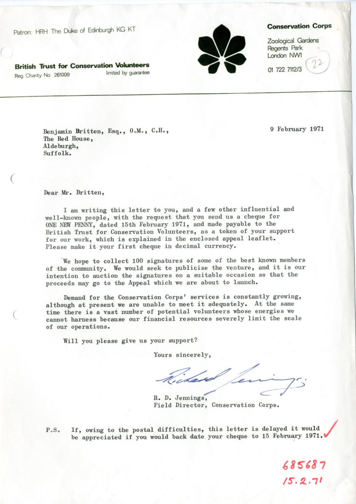 A letter from the British Trust for Conservation Volunteers asking Britten to write a one penny cheque to be auctioned off to raise funds for the charity.
