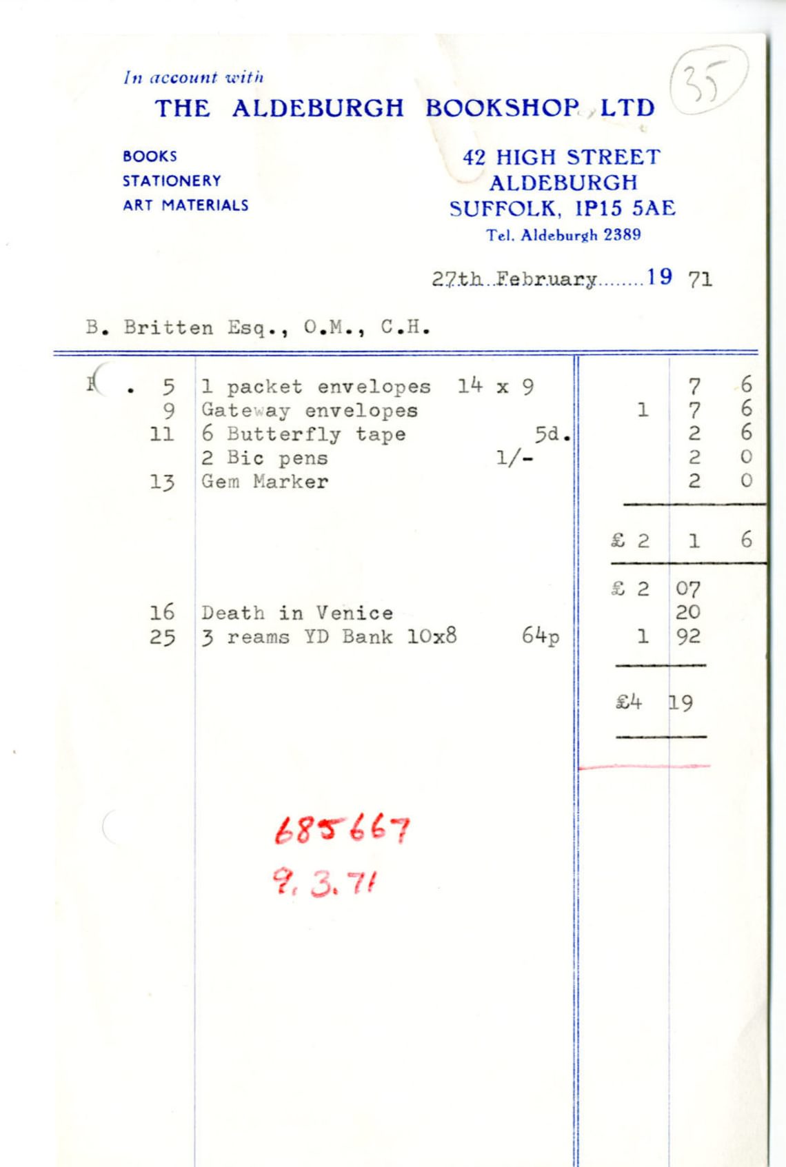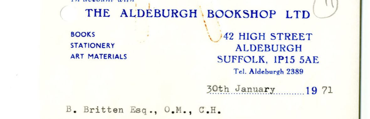 Through all of this, the composer’s work went on, and the Aldeburgh Bookshop bill that covers the decimalisation day makes this clear. On the day after the currency change, 16th February 1971, Britten spent 20 new pence buying a copy of Thomas Mann’s novella Death in Venice. Next month’s bill shows him buying Thomas Mann’s letters. The wheels are beginning to turn and the process starting that would result, two years later, in Britten’s last opera: another illustration of how the seemingly mundane files of receipts in the archive show traces both of Britten’s working life and the wider social developments around him.