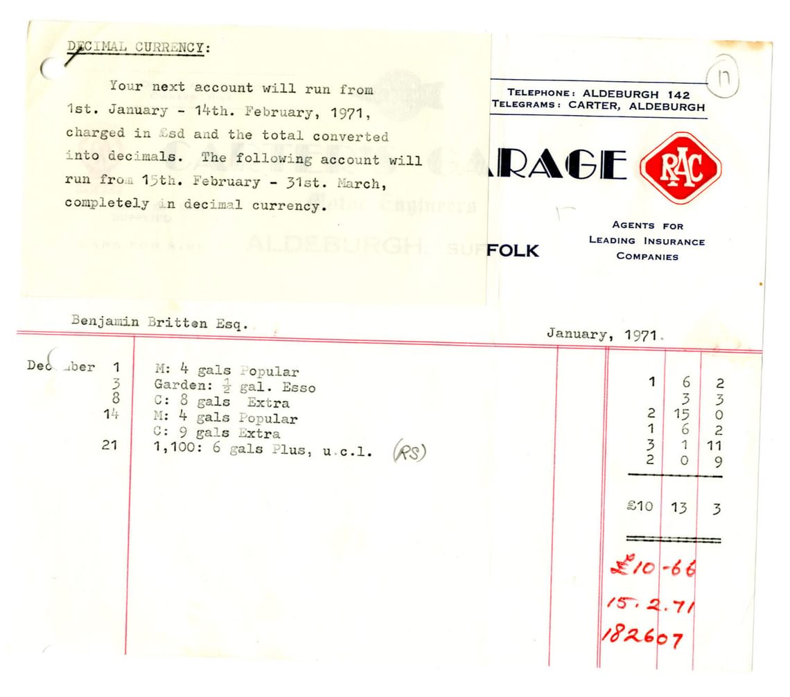 Meanwhile, the businesses with whom Britten dealt were also getting ready for the change. On 31st January, Carter’s garage in Aldeburgh issued Britten a bill on which it was noted that the following month’s bill would be in the new, decimal currency with transactions in early February converted to the new form. His monthly bill from Aldeburgh Bookshop issued at the end of February sees transactions in L.s.d. throughout the first half of the month, then in pounds and new pence for the second half: a reminder of the work that businesses all had to do to keep things functioning during the changeover.