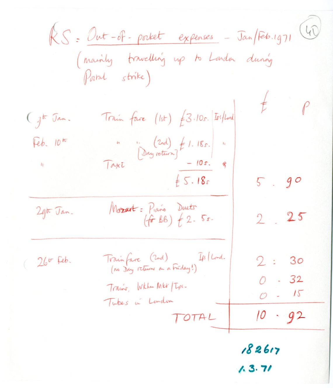In the early 1970s there was a lot on everybody’s mind, with decimalisation just one among many hurdles. One of Britten’s financial documents from early 1971 hammers this home, a list of expenses submitted by his assistant Rosamund Strode. The period covered is January – February 1971 and, as she notes, this includes some expenses that were charged in old money and some in new; she converts the former to decimal format in order to generate one single figure to claim. She notes that the majority of the expenses relate to travel to and from London, acting as a courier during a postal strike: the authentic note of the UK in the early 1970s. The railways at least were working, although in that period of power cuts, three-day week and general unrest it was probably only a matter of time before that ceased to be the case.