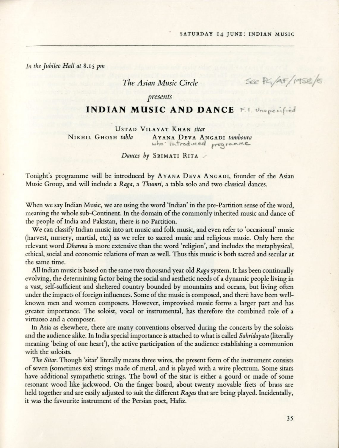 Page from the 1958 Aldeburgh Festival programme, describing the concert by Ustad Vilayat Khan that year. (PG/AF/1958).