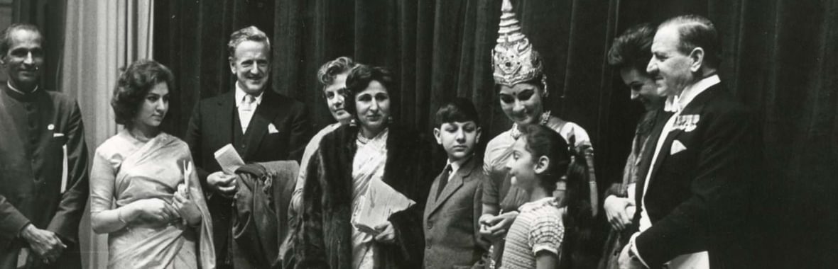Also on the stage in this photograph are the High Commissioner of Pakistan, His Excellency Mohammad Yousuf, and members of his family. They surround two more figures who had roles to play in cultural cross-fertilisation. The whole party are looking at a small girl in western dress who has clearly just said something that amuses Pears: this is the youngest of the Angadis’ four children, Chandrika (also known as Clare), who went on to be the first Asian model to appear in Vogue. Behind her, in a headdress that towers over the rest of the group, is a dancer whose life-story embodies Western-Indian cultural fusion. Indrani Rahman was born in Chennai in 1930, from her birth the product of cultural fusion: her father, Ramalal Balram Bajpai, was a north Indian who had gone to the United States to study, while her mother, born in Michigan as Esther Luella Sherman, converted to Hinduism on marrying, took the name Ragini Devi, and devoted herself to the revival of Indian classical dance. Her troupe toured in Europe and America, as well as in India; Indrani learned to dance in this company and it was in New York (where, after independence, her father became India’s consul-general) that she met the architect Habib Rahman, who had been asked to take a small non-dancing part in a performance. Aged fifteen she eloped with Rahman and married him, eventually having two children. This crossed yet another cultural divide, as Rahman was Muslim. During this period her career straddled the worlds of Indian tradition and western consumer culture: she was devoted to learning the classical dance tradition of Orissa, but also undertook some advertising work to finance her studies (an article in The Hindu records that she deliberately excluded this work from her scrapbooks) and in 1952 entered and won the first Miss India contest. From her mid-twenties, however, she was able to concentrate firmly on dance, turning down offers of film roles and working, as her mother had done, as an ambassador for traditional Indian dance. It is in this life-long role that we see her on stage with Peter Pears, smiling down at the young Chandrika Angadi.
