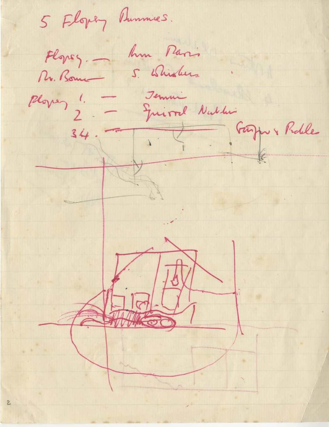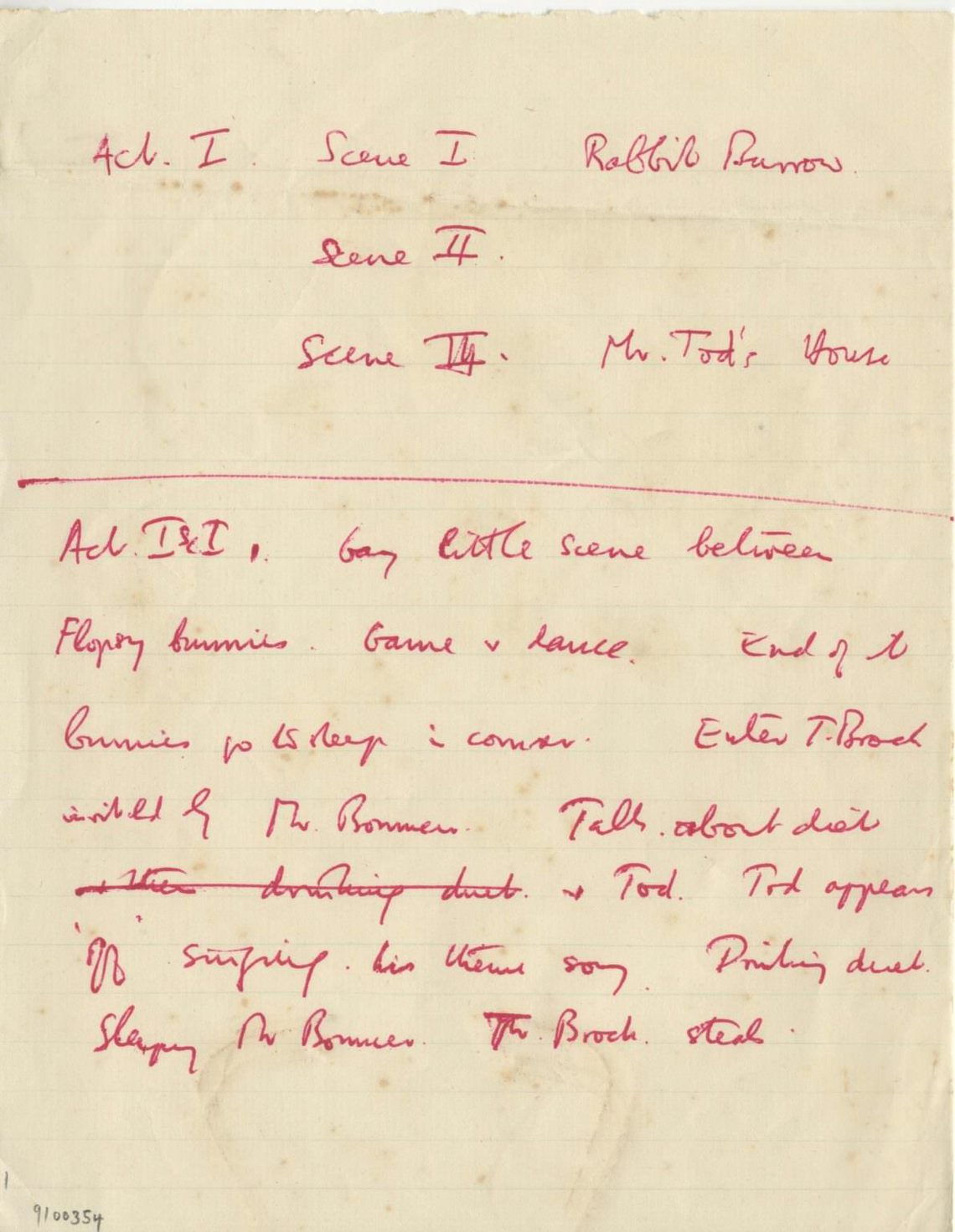 Britten’s outline for the opera progressed only as far as three scenes for Act I. He wrote out the synopsis in red ink: Mr Bouncer is looking after his grandchildren while their parents Benjamin and Flopsy Bunny are away. The unscrupulous badger steals the flopsy bunnies (with plans to eat them) while Mr Bouncer sleeps. A ‘Drinking duet’ takes place, but it’s unclear whether this is sung by Brock and Bouncer or Brock and Tod. Things have moved relatively swiftly as scene iii takes place in one of Mr Tod’s houses, where the badger eventually falls asleep.