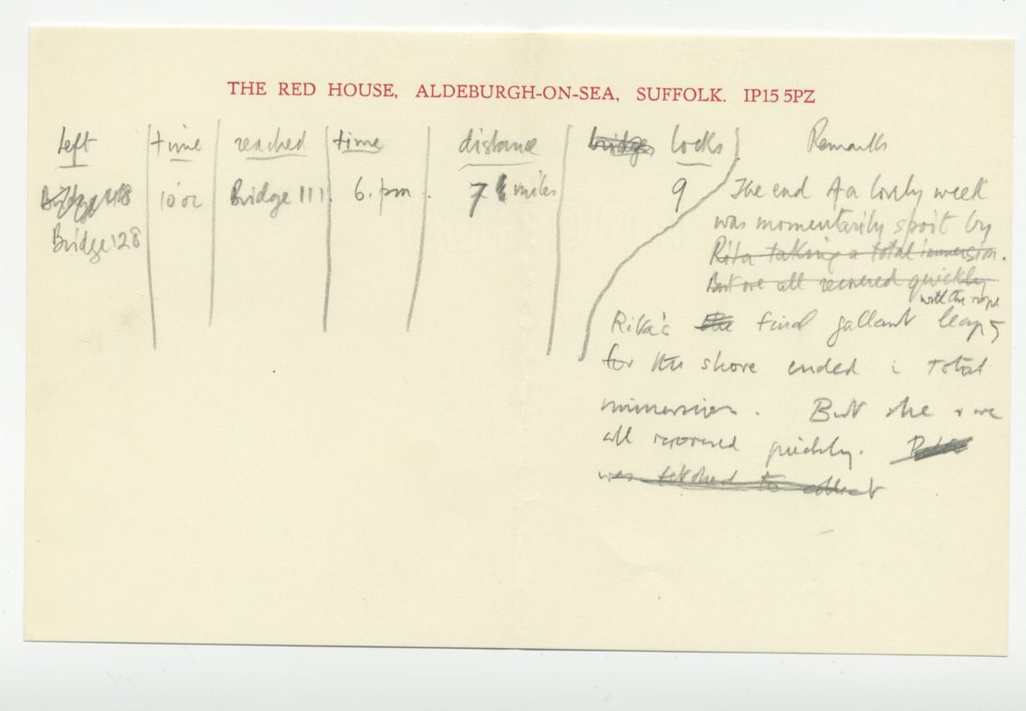 Each of these often creased or well-thumbed documents tells a story. One, selected from many, tells a story from near the end of Britten’s life: a copy of Nicholson’s Guide to British Waterways (volume 1, South-East). Nicholson’s Guide gives detailed information for people cruising on Britain’s canals and navigable rivers: the location of locks, bridges, turning points and necessary services such as shops, pubs and places to empty chemical toilets. This is not how one normally envisages Britten and Pears on their travels: good hotels and Britten’s Rolls Royce are the more usual picture. But this is evidence of a canal holiday that they did actually take: picking the book off the shelf, it falls open on a particular page and out comes a piece of Red House notepaper with pencil notes in Britten’s hand, recording a journey on the Oxford Canal.