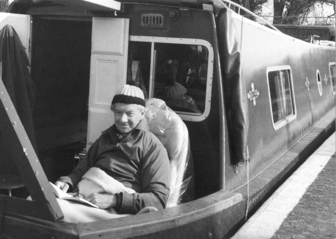 Britten, wearing jacket and woollen hat, seated in the bow of the barge, reading. The narrowboat is the ‘Emelia di Liverpool’, owned by the baritone John Shirley-Quirk. Photographer: Rita Thomson.