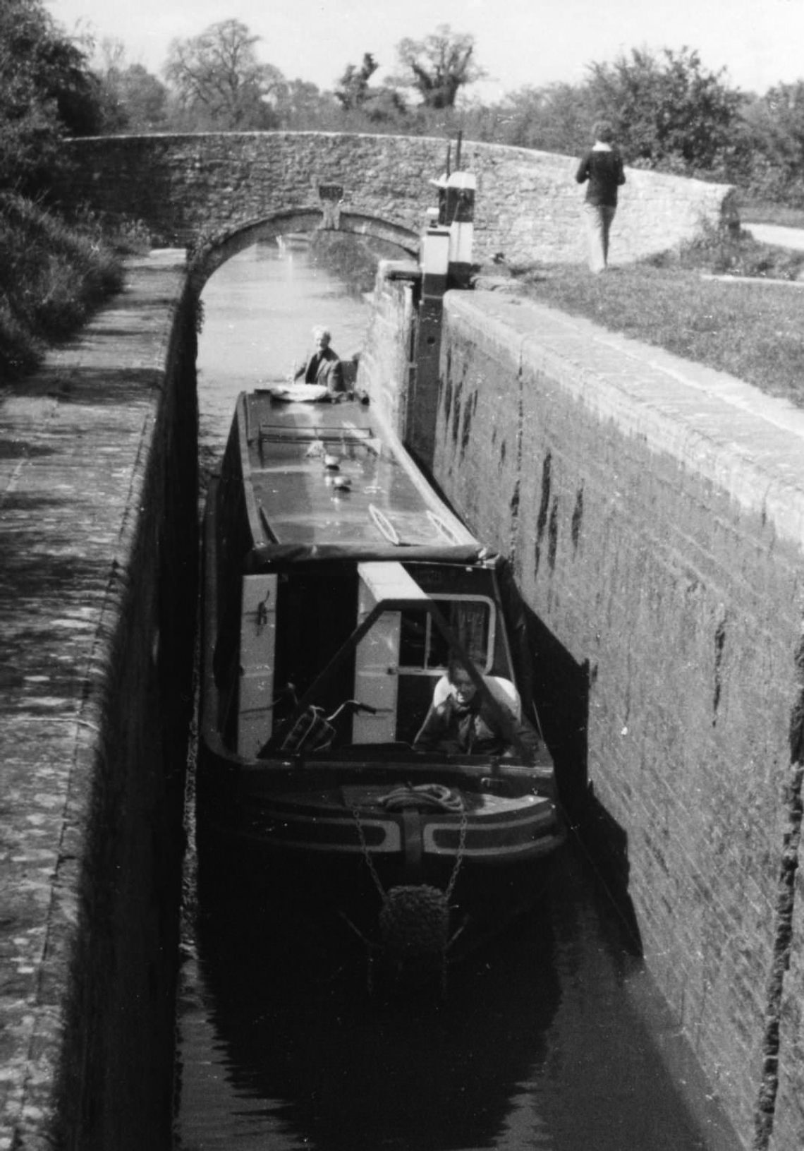 Pears in background steering John Shirley-Quirk’s narrow boat, ‘Emelia di Liverpool’, Britten sitting in prow, foreground, with Polly on towpath, right, going to close the lock gates. Photographer: Rita Thomson.
