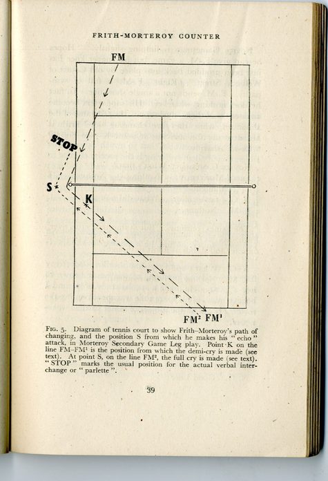 Diagram of a tennis court, from Gamesmanship, showing the precise point at which, during a change of ends, a Gamesman should hint that he has a secret heart condition.