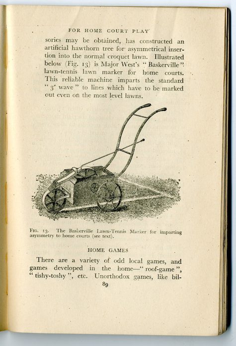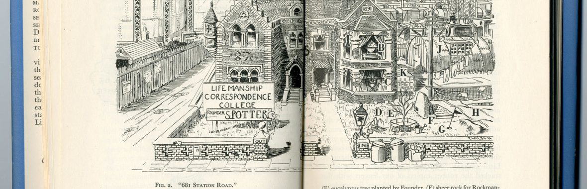 Potter was an obsessive games player and drew on his own experience, recast, for the books. A motif that occurs a couple of times is the home tennis court: speaking in Gamesmanship of the very earliest days of the concept, Potter talks about games of tennis in the 1920s “at the Farjoens’ house near Forest Hill, where Farjoen had wrought such havoc among so many visitors, by his careful construction of a “home court”, by the use he made of the net with the unilateral sag, or with a back line at the hawthorn end so nearly, yet not exactly, six inches wider than the back line at the sticky end.” Later in the book he indicates the way that gamesmanship has become an exact science with an illustration of a machine for marking up a lawn tennis court so that all lines have “the standard 3” wave”, even on the most level turf, while in One-Upmanship the illustration near the start of the Lifemanship Correspondence College now supposed to be operating in Yeovil shows, in the garden, a shambolic tennis court labelled “Vicarage type”.