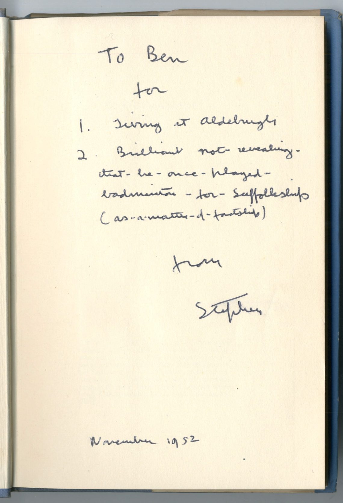 Presentation inscription in Britten’s copy of One-Upmanship.