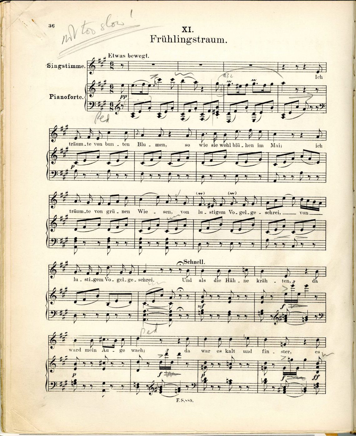 Not surprisingly Pears made numerous annotations in this other (non-Birthday) score in pencil. He also wrote out the text in ink, although of course he sang from memory in public. It’s now possible to read his own interpretation of editorial instructions. For example, the indication at the beginning of Wasserflut to sing Langsam has Pears’ pencil marking ‘Not too’ beside it. Britten’s thoughts on dynamics follow suit. Langsam is also found at the beginning of Einsamkeit, beside which he has written ‘Not too slow.’
