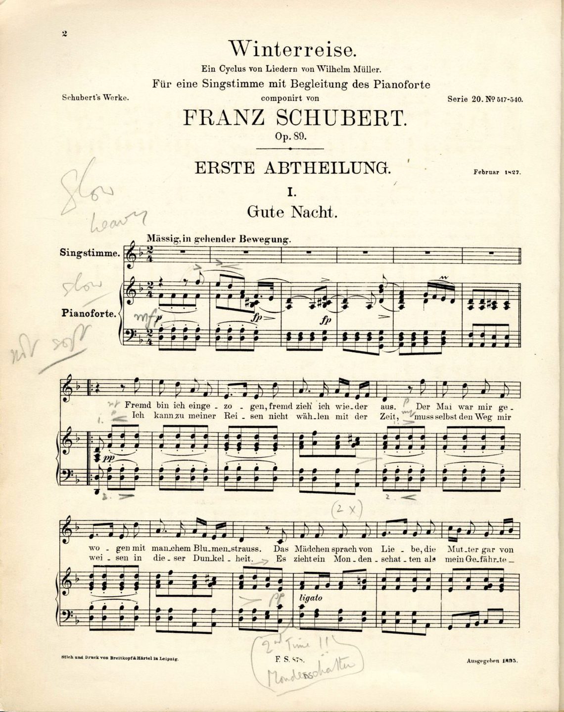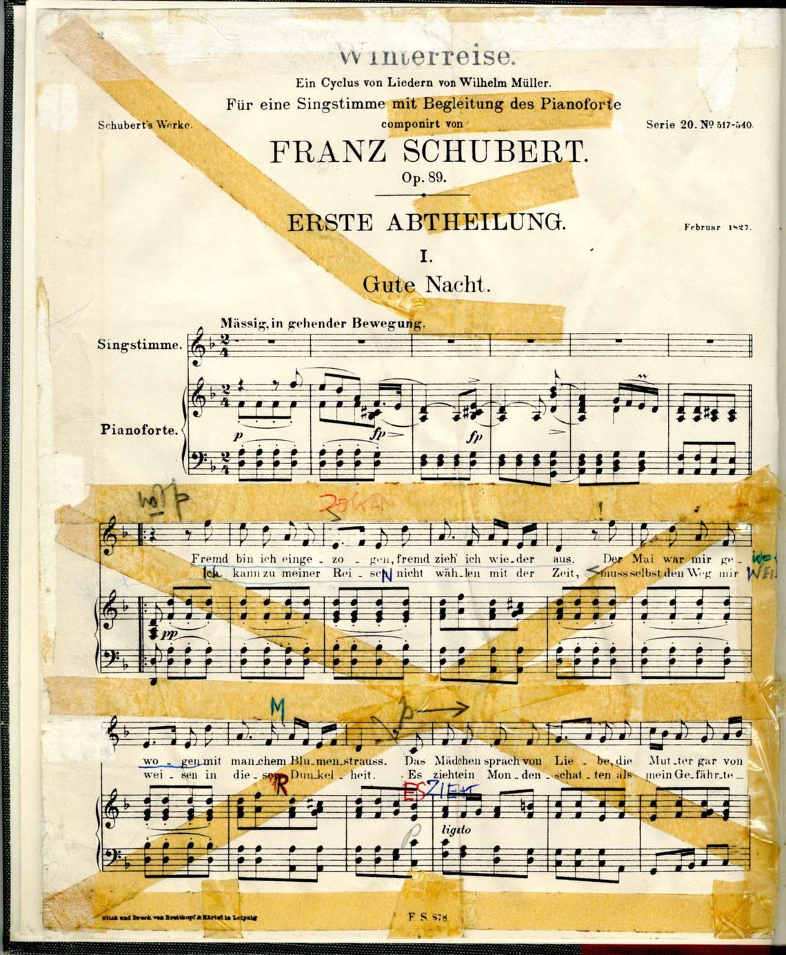Pears’ birthday gift score of Winterreise is a case in point. This edition of Winterreise was the ideal size for the piano music stand so it seemingly became the copy Britten used rather than Pears. It is filled with Britten’s pencil markings and provides a glimpse into his technique, timing and at times slight adjustment of Schubert’s music. It is unlikely the tenor regretted the loss of his score. He had another Breitkopf and Härtel edition to work from, and it shows a great deal of wear and (literally) tear. Years of use in performance and teaching warranted conservation so it was eventually bound in new boards. The copious application of sellotape to the first page attests to Pears’ own attempts at restoring it from overuse.
