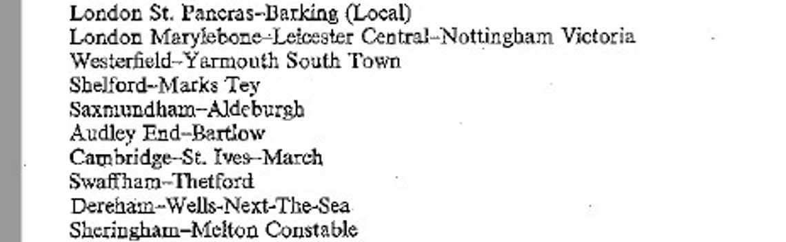 Page 102 of “The Reshaping of British Railways” begins the litany of proposed closures, starting with a list of lines from which passenger services are to be withdrawn. (The full list runs for many pages: the report in its entirety can be seen here). On page 105 are listed “Westerfield - Yarmouth South Town” and, two entries below, “Saxmundham – Aldeburgh”: the line up the Suffolk coast from the edge of Ipswich to Lowestoft and Yarmouth, and the spur that carried passengers from that line down to the sea at Aldeburgh. At a stroke, Aldeburgh (and its Festival-goers) would go from having its own station, to using Ipswich station some twenty-five miles away as their railhead.