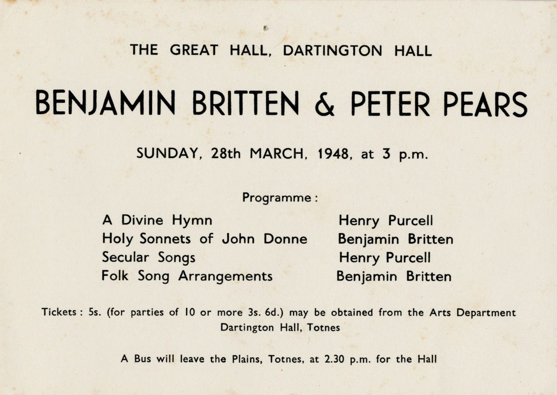 Holst remained at Dartington Hall for a further eight years establishing a music department that was way ahead of its time as well as arranging performances and recitals by visiting musicians. Since Summer 1942 Britten and Pears had, as conscientious objectors, been travelling the country giving recitals, often under the auspices of CEMA, in order to boost morale and maintain art in wartime. Holst invited them to give a recital at Dartington in October 1943 and the three met for the first time.