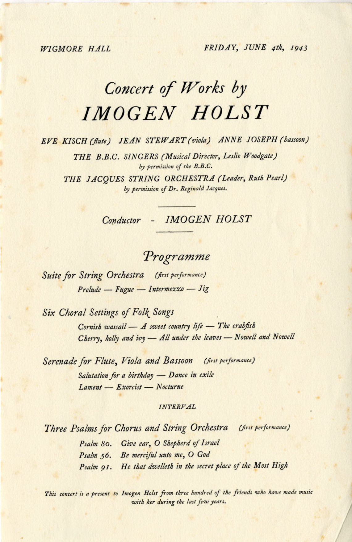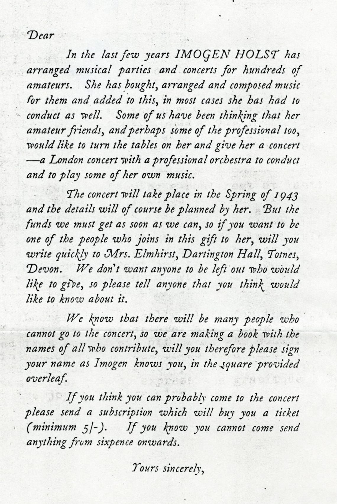 The kind letter Holst received in summer 1942 must have helped her on the road to recovery, as by Spring 1943 she was working on two larger works for string orchestra no doubt with the promised concert and the Jacques String Orchestra in mind. Organisation of the concert was led by Wise who sent a form letter to friends and the many amateur musicians Holst had worked with over previous years, asking for contributions to the gift – a thank you for the many hours and untold energy she had given to their music making. The response was huge.