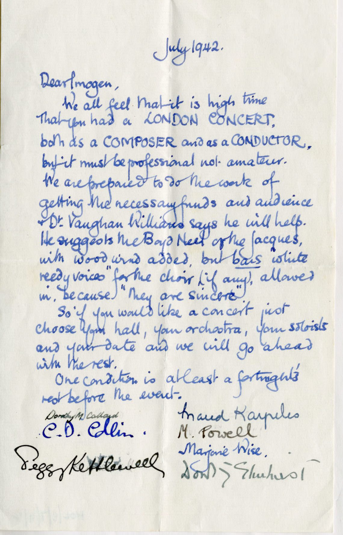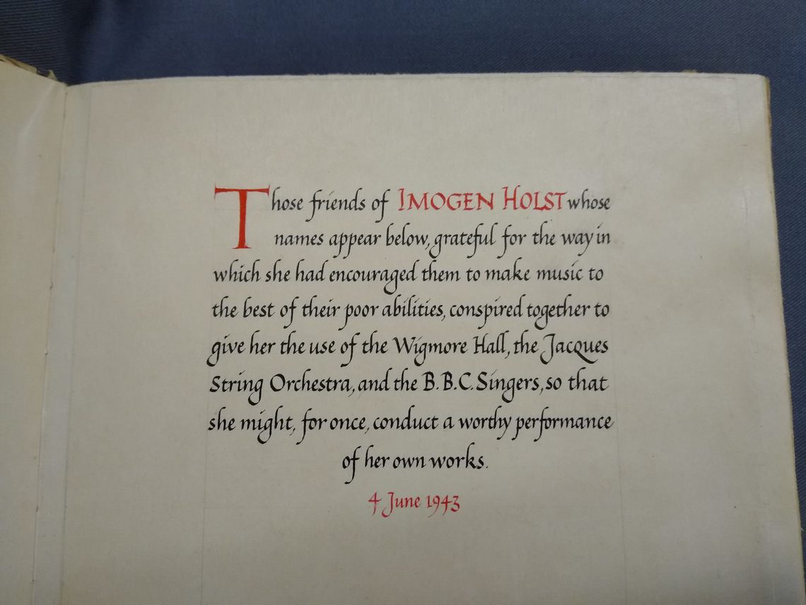 In July 1942 Imogen Holst received a wonderful letter from a group of friends proposing to organise a concert of her works in London as a thank you gift. Holst was at this time recovering from overwork and exhaustion and this thoughtful gesture would no doubt have raised her spirits.