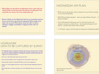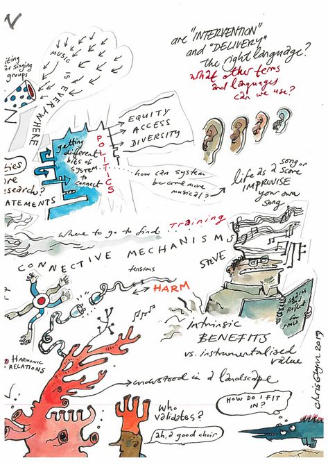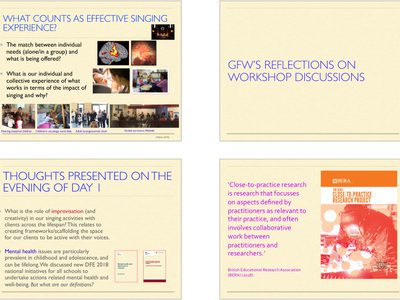 Carry out an impact study: researchers/singing practitioners working together on how to articulate and share insights from research and how to get the experience of practitioners into the research domain. Creating….a series of events? A process?…to enable practitioners to harness research insights, and to help researchers understand the mechanisms at play within practice. We need to develop and/or discover the common language, within a reflective and reflexive practice dialogue. Might use the model of ‘close to practice’ research… might consider auto-ethnography. How to incentivise a shared language? How do we keep the language moving?