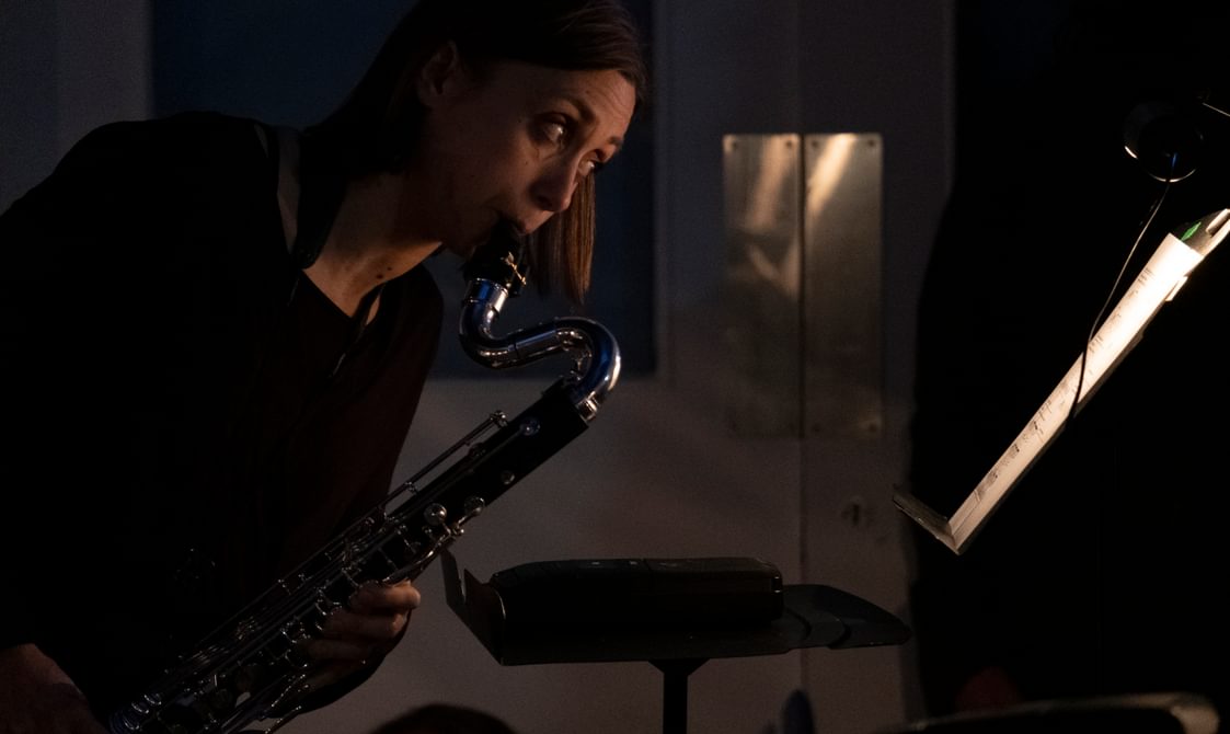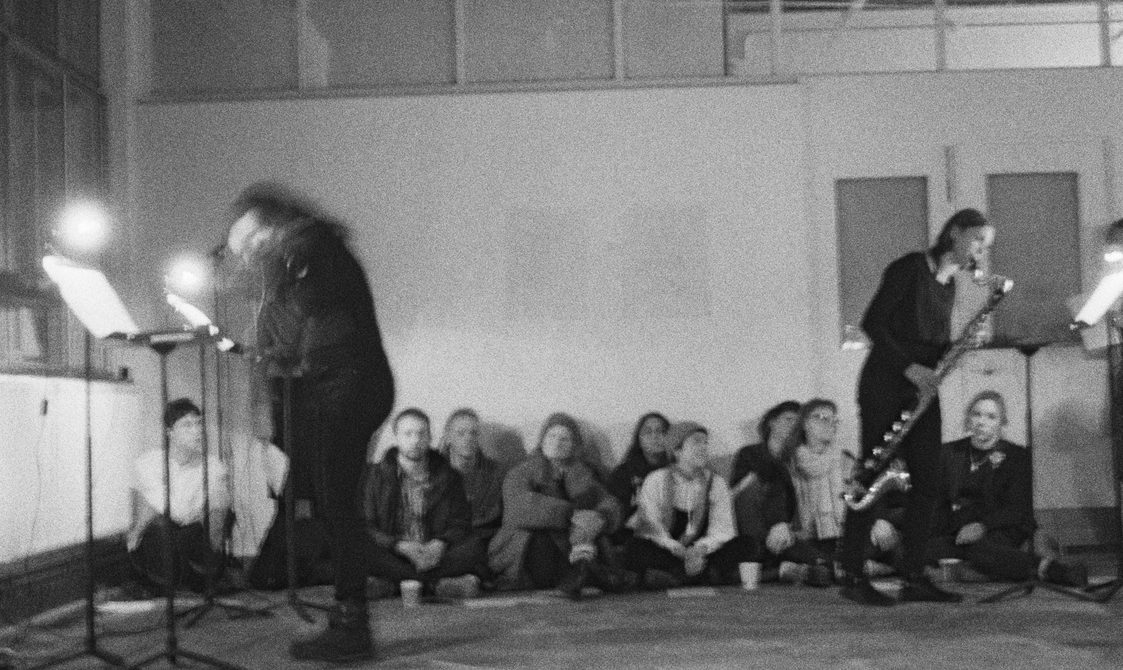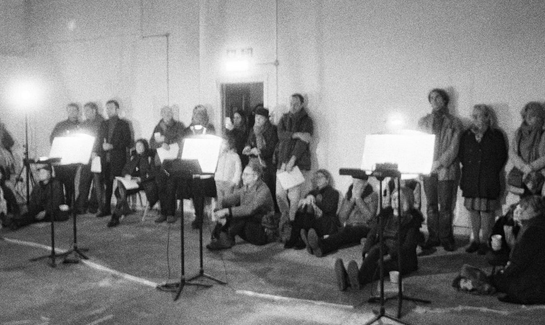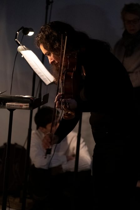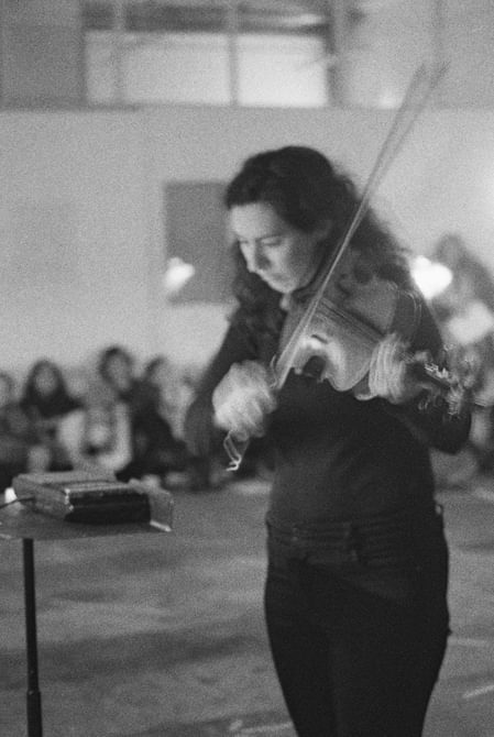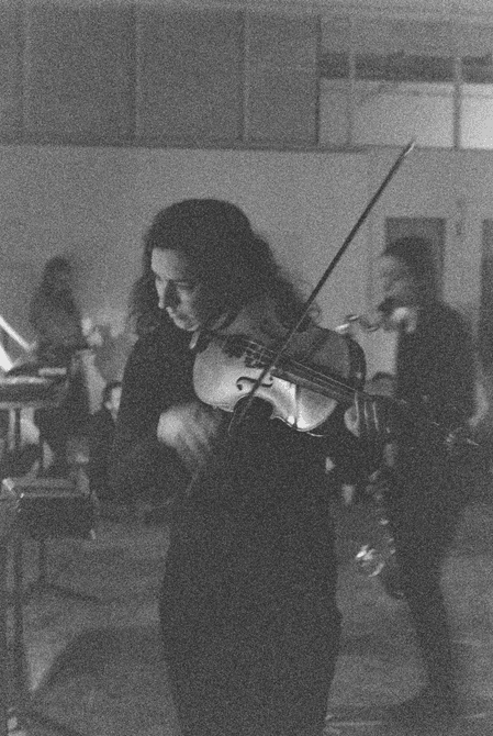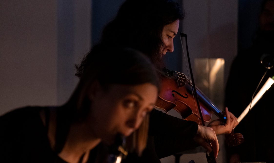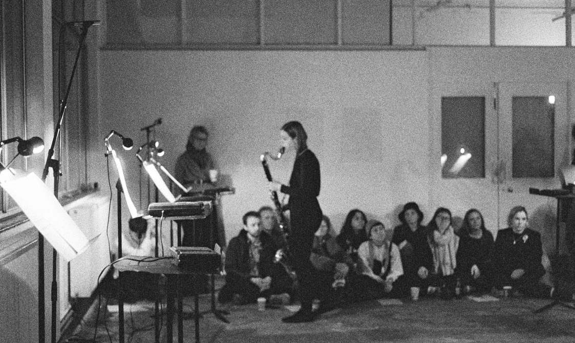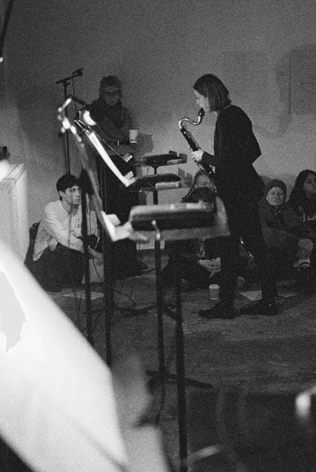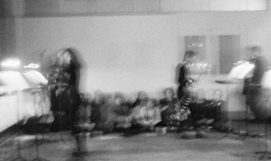 The final piece, Stable Processes with Slow Ornaments, featured eight tape players across which a chord sequence was split in individual pitches. Because they are activated at different times and dubbed individually, the progression of the chords is variable on each performance. The human performers, bass clarinet and viola, navigated ‘stations’ featuring a tape player and a score, following specific instructions that required them to play parts only upon hearing pitches at their station.
