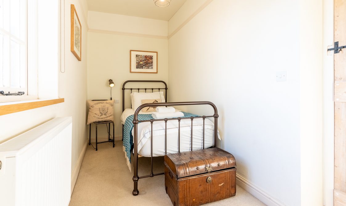 The original steep staircase leads to the main bedroom with a king size bed with the single room across the landing which can also accommodate a travel cot.