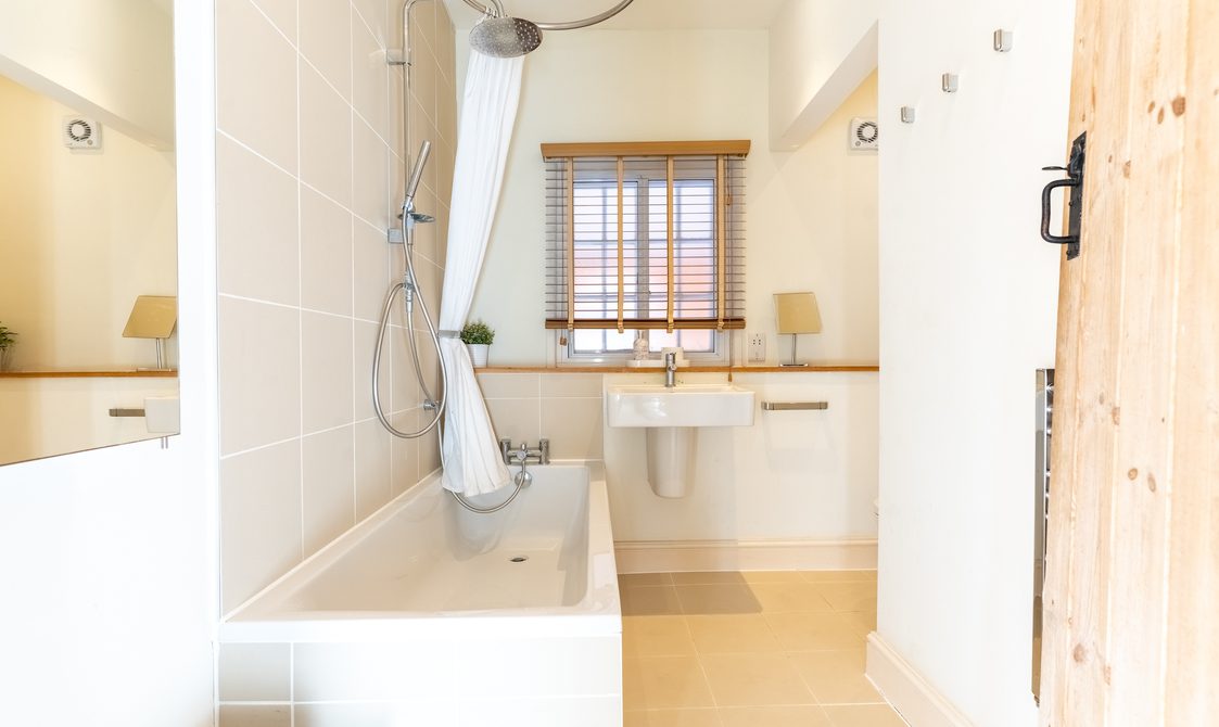 The modern bathroom, featuring a rain shower, large bath, and WC, perfectly balances original period features with the comforts you would expect from a property so thoughtfully appointed.