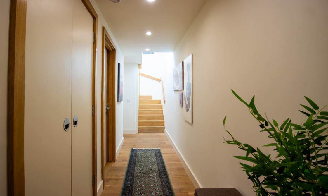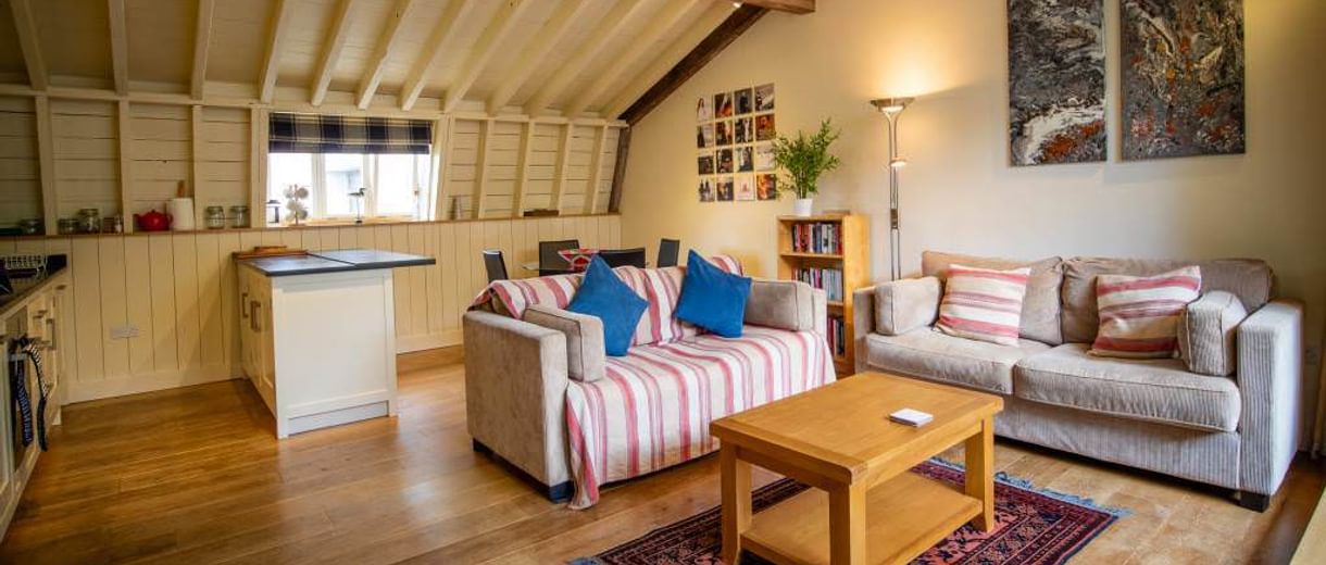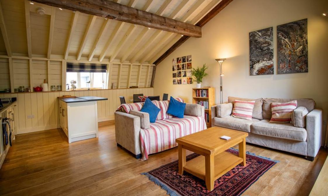 The oak stairs opens onto the open plan living area. The kitchen area is equipped with a fridge freezer, a BOSCH dishwasher, induction hob, cooker and microwave oven. A circular dining table and four chairs lead onto the seating area. Here there are two comfortable sofas, a 50” Samsung 4k SmartTV (new for summer 2024) and DVD player. A selection of books and DVDs are available.