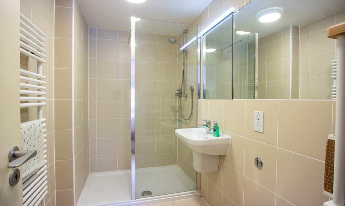 The hall opens to the main bedroom bedroom with a Hypnos king-sized bed with tables either side and lamps as well as a wardrobe. There is an ensuite shower, loo and handbasin.