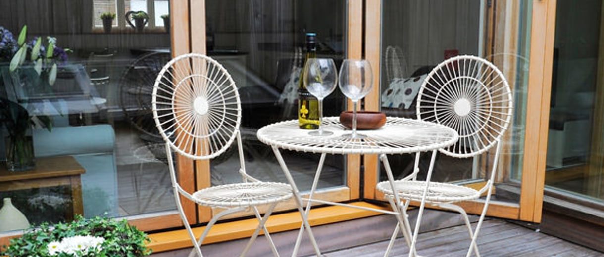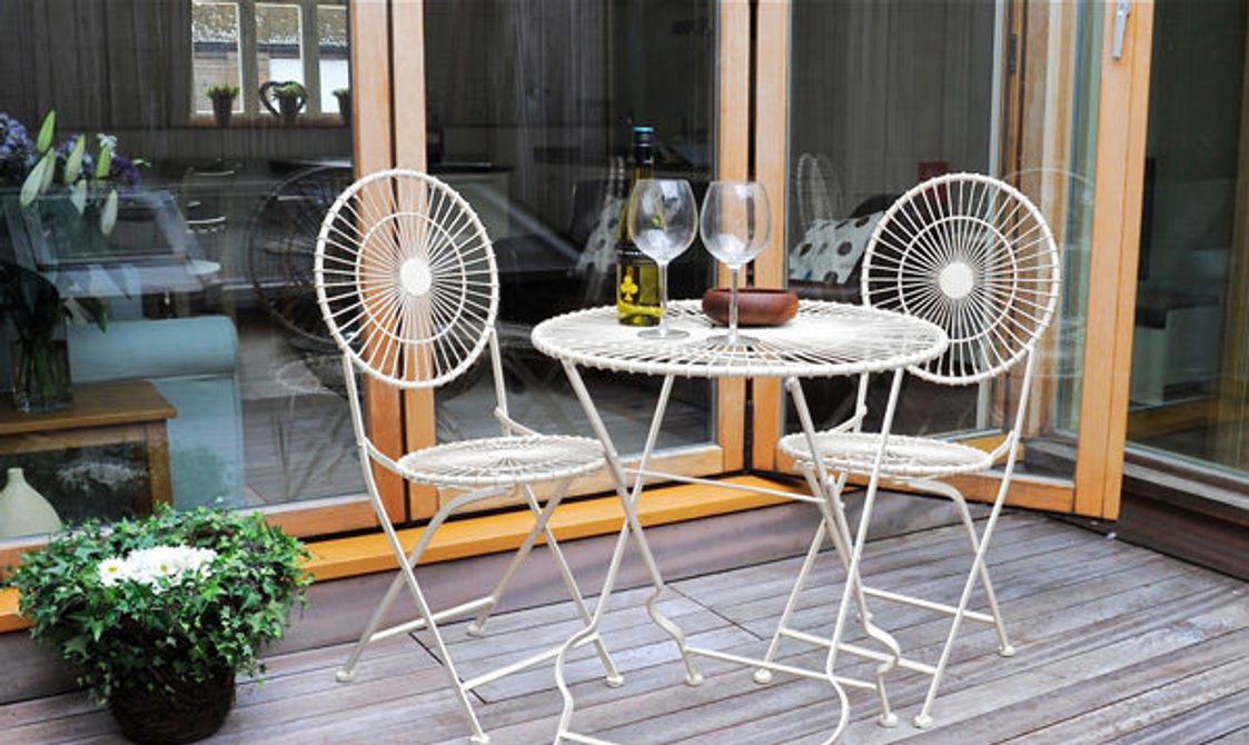 The outside terrace area is reached by opening the large oak framed glass door and there is a table and chairs.