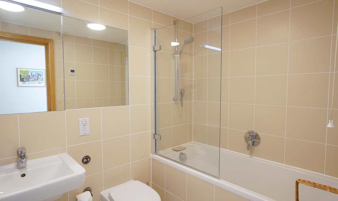 Further along the hall is the utility cupboard, followed by the family bathroom with bath, overhead shower, WC and basin. At the end is a twin bedroom (it is possible to convert these into a double bed) with bedside tables and lamps and a wardrobe.