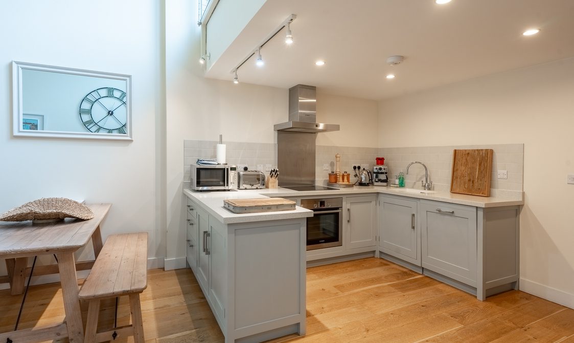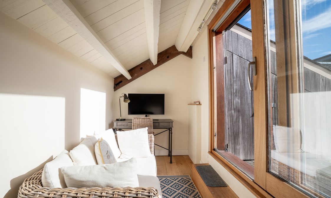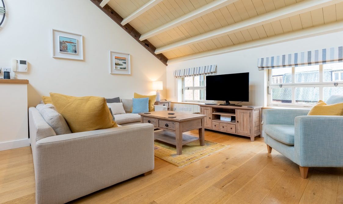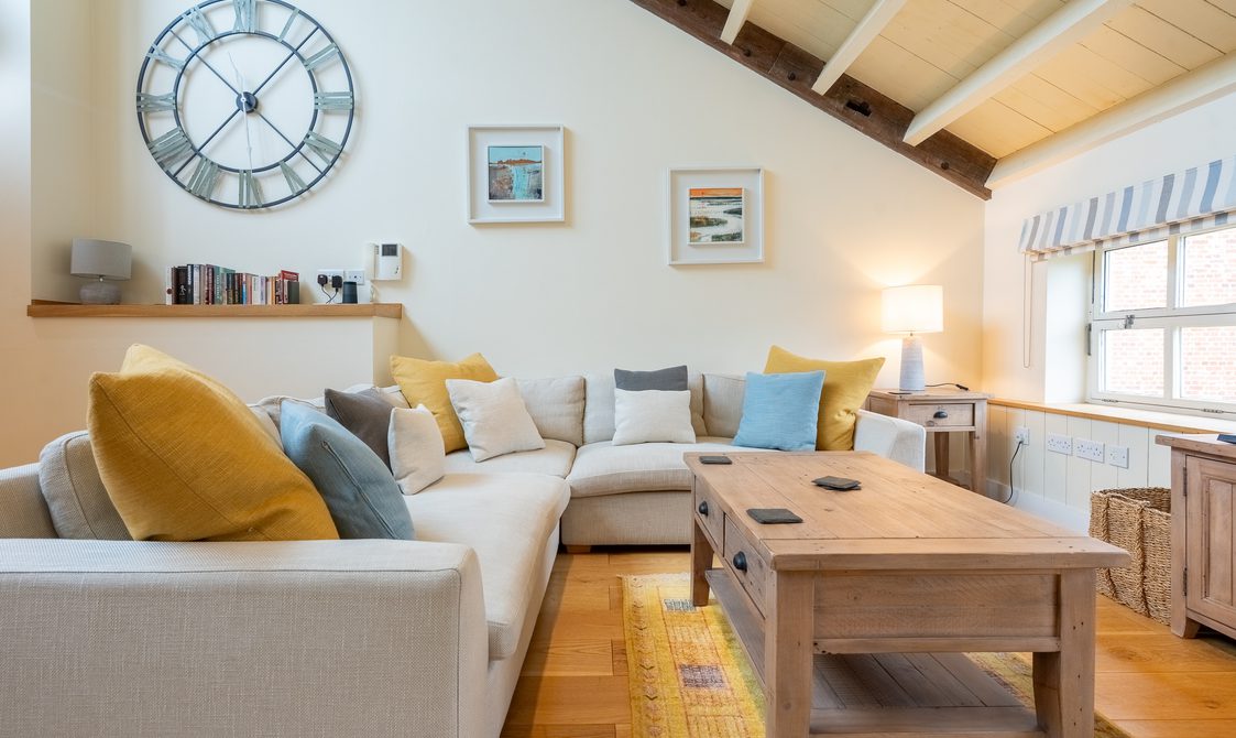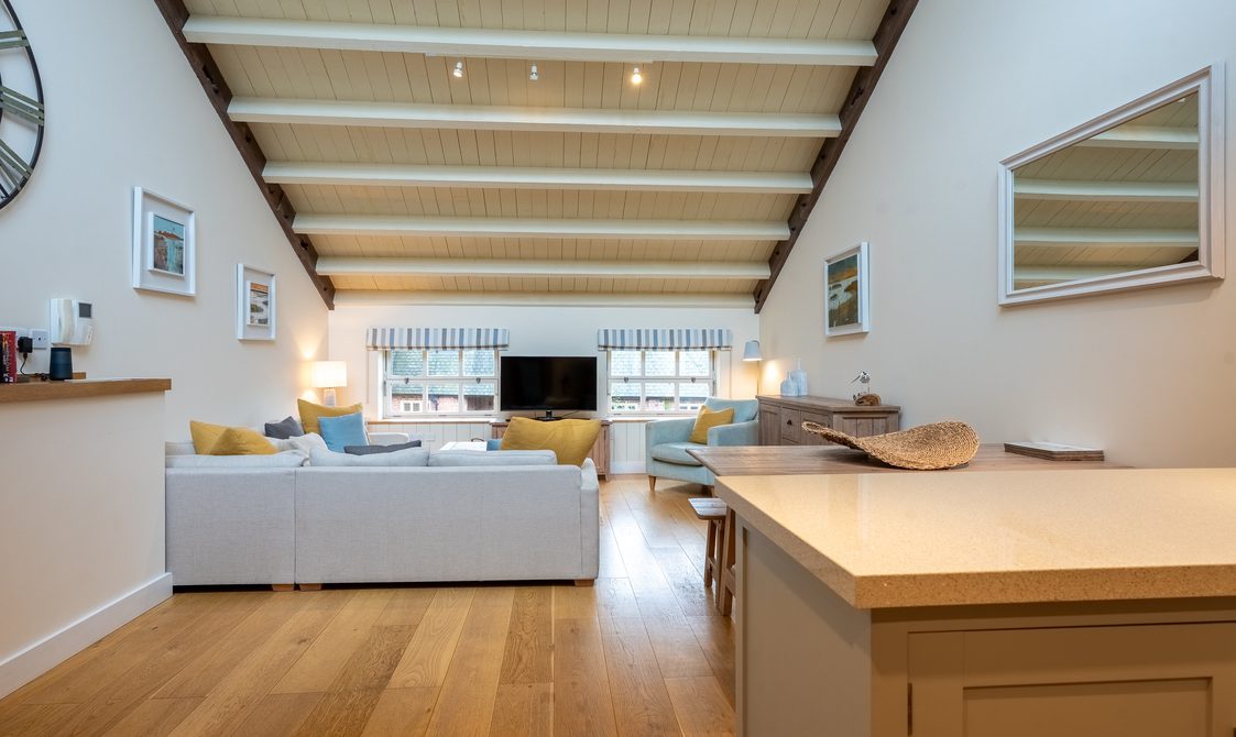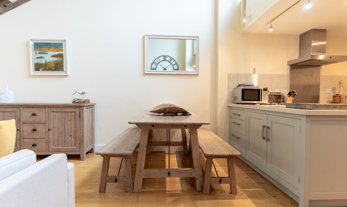 The kitchen is fully equipped with everything you would expect from a property of this standard, ideal for guests keen to cook with the best of Suffolk’s seasonal produce. A reclaimed wood dining table with generous seating creates a welcoming space for dinner with family and friends, while the lounge’s large corner sofa and cosy armchair offer instant comfort, with views over the beautifully maintained courtyard.