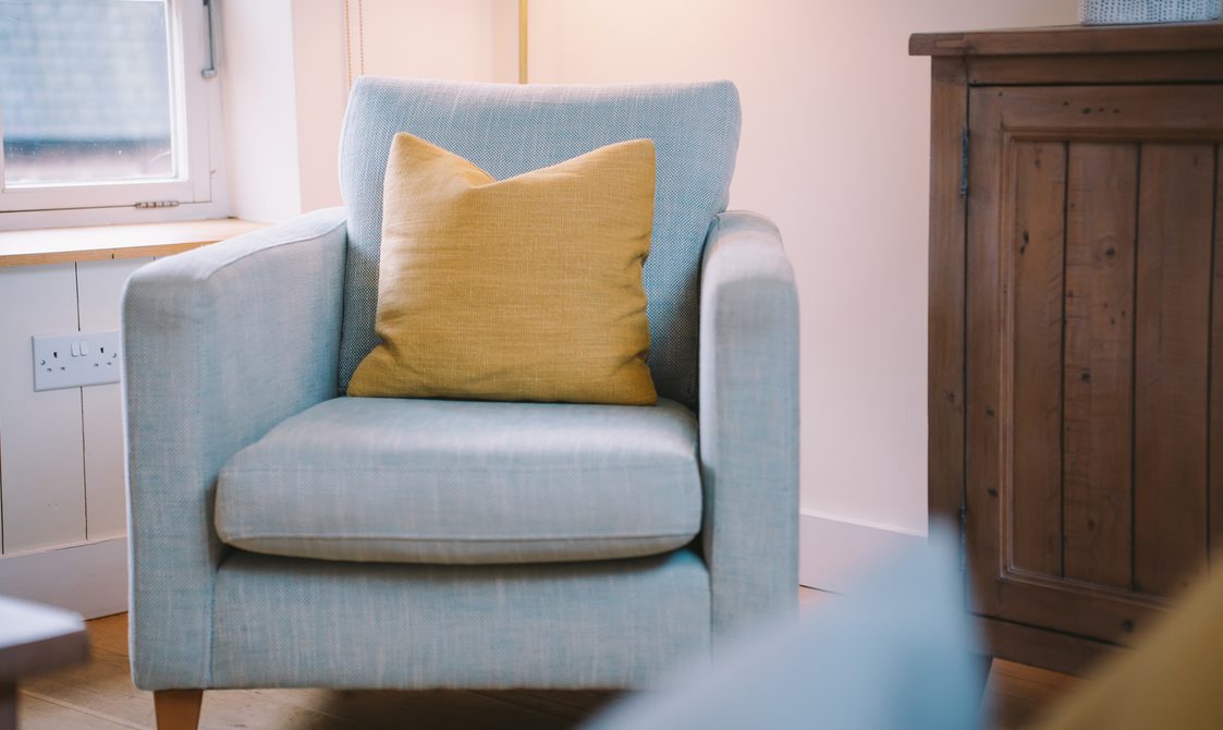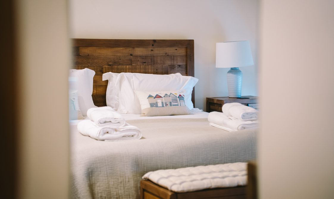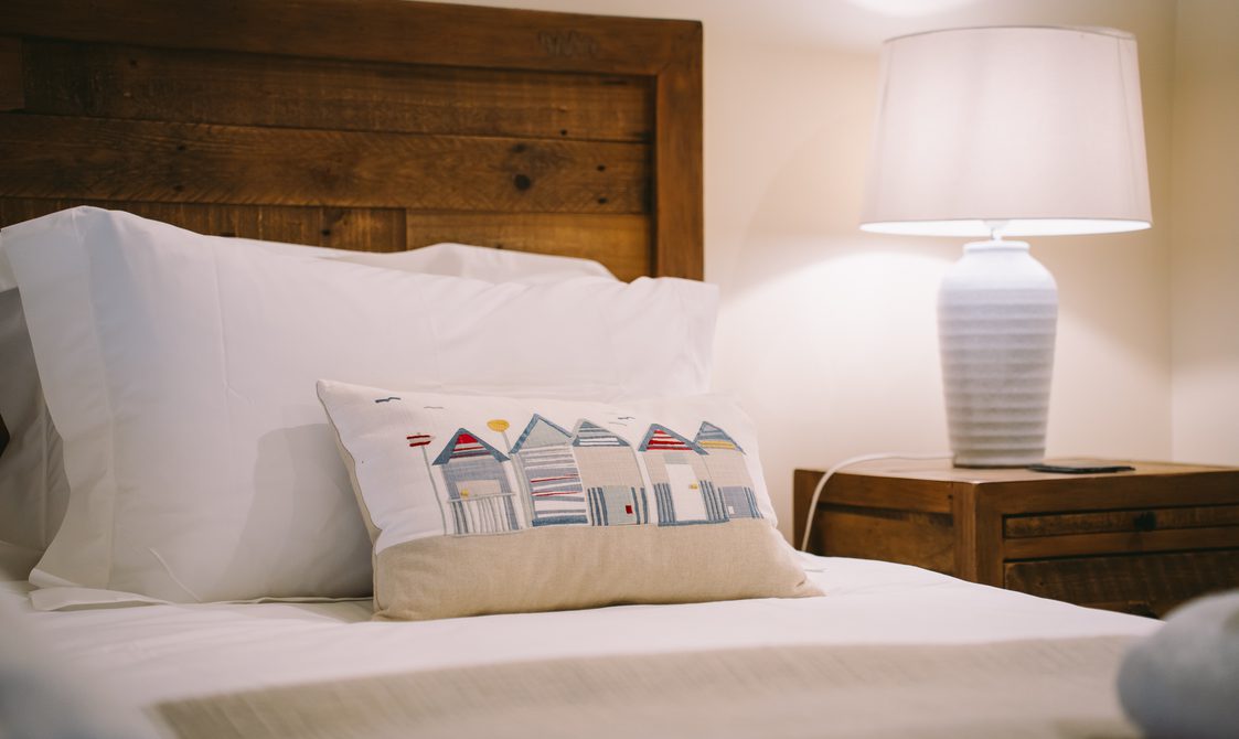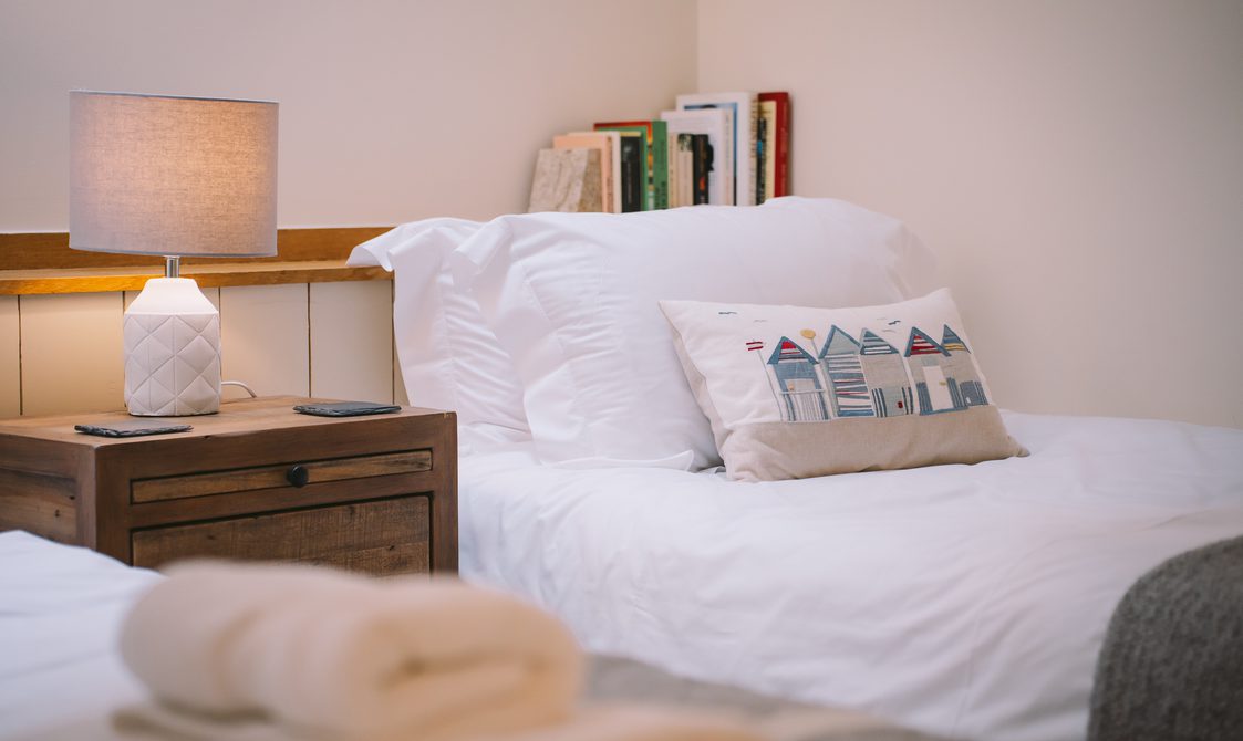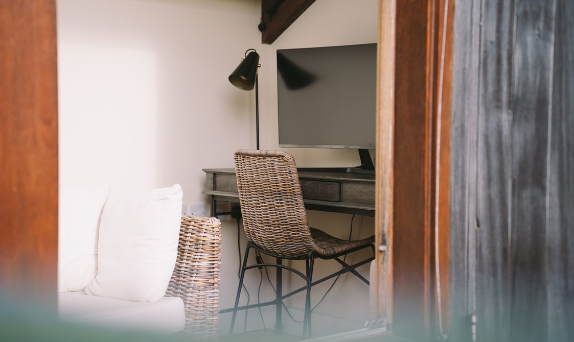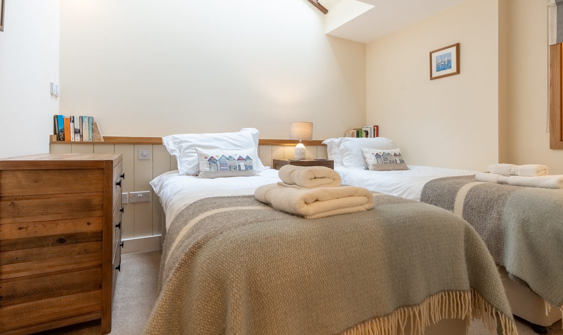 The kitchen is fully equipped with everything you would expect from a property of this standard, ideal for guests keen to cook with the best of Suffolk’s seasonal produce. A reclaimed wood dining table with generous seating creates a welcoming space for dinner with family and friends, while the lounge’s large corner sofa and cosy armchair offer instant comfort, with views over the beautifully maintained courtyard.